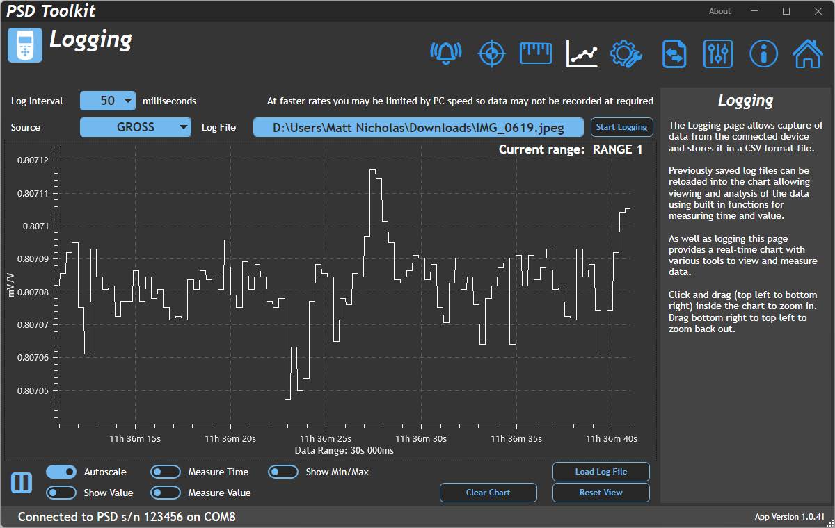 Provided with the PSDS handheld load cell display is the free toolkit software for setting-up the indicator and calibrating the load cell sensor.  The software free datalogger incorporated, a chart recorder and the ability to record the data that can be opened in Excel for further analysis.