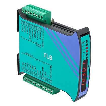 Load Cell Systems offers the TLB din-rail or panel mounted load cell transmitter, optional analog output current: 0-20 A, 4-20mA and voltage: +/-10V, +/-5V. Standard wtih RS485 digital output (Modbus RTU / ASCII protocol) for communications with a PLC or remote display. The 5V excitation can drive up to 8 (350Ω) load cells through a junction box. The TLB is ideal for system integrators, the din-rail mounted device is compact taking up little room in electrical panels. The Fieldbus options allows communications to large industrial networks.